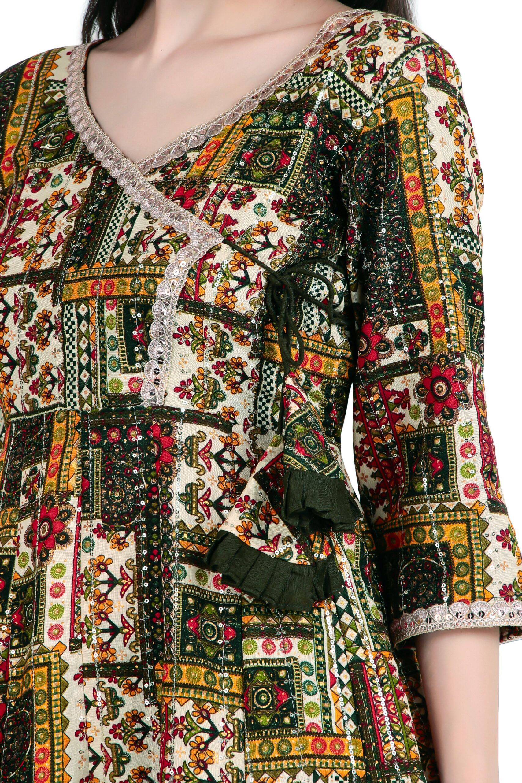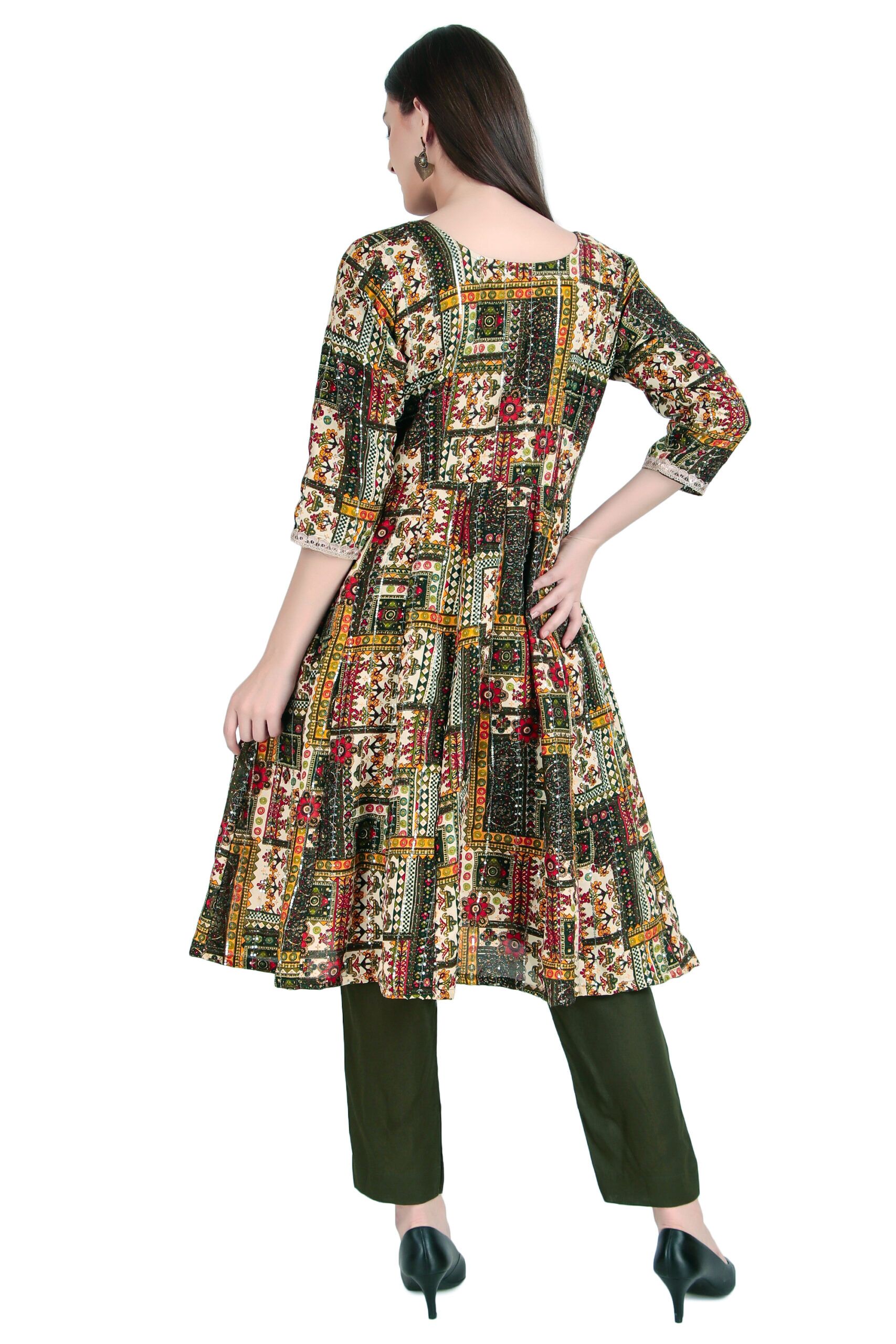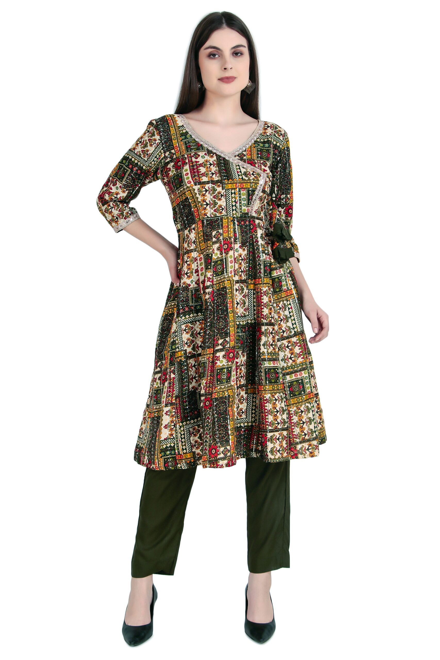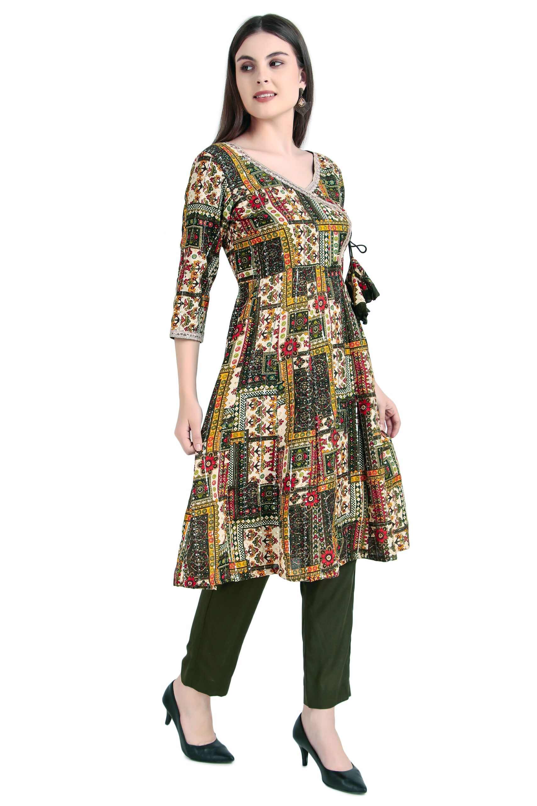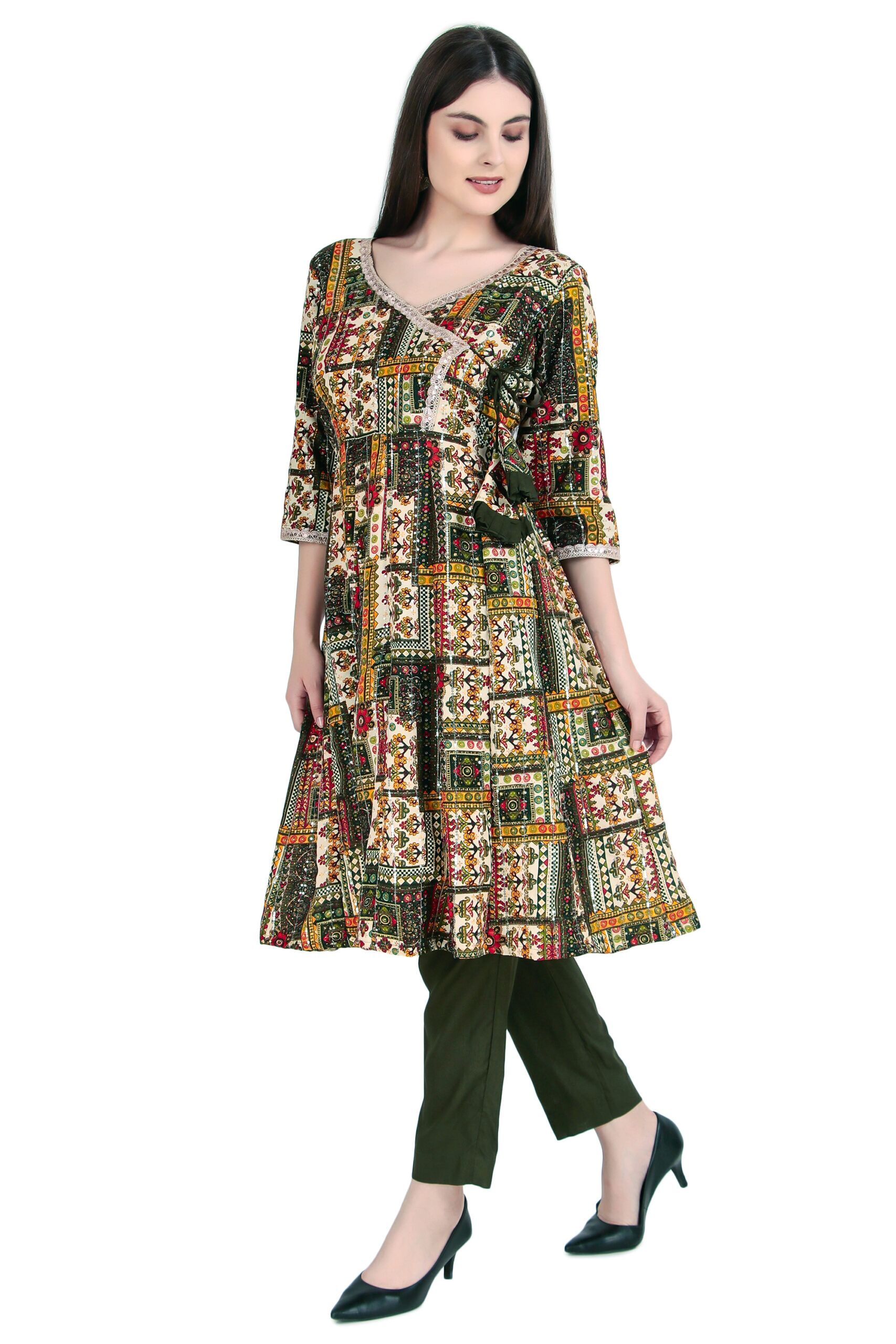 Elevate your ethnic wardrobe with this beautifully designed multicolor Anarkali kurti, crafted from premium cotton fabric for ultimate comfort and breathability. This kurti features a vibrant and intricate all-over print inspired by traditional Indian motifs. The wrap-style neckline and sleeves are accentuated with delicate gota lace, adding a subtle touch of elegance. With its flared silhouette and 3/4th sleeves, this kurti is perfect for festive occasions, casual outings, or even semi-formal gatherings. Pair it with leggings or palazzos for a complete ethnic look. Fabric: Soft & breathable cotton Design: All-over multicolor traditional print Style: Anarkali flared kurti with wrap-style neckline Sleeves: 3/4th sleeves with lace detailing Neck: V-neck with gota lace border Occasion: Festive, casual, daily wear, and ethnic gatherings Size Options: Available in various sizes