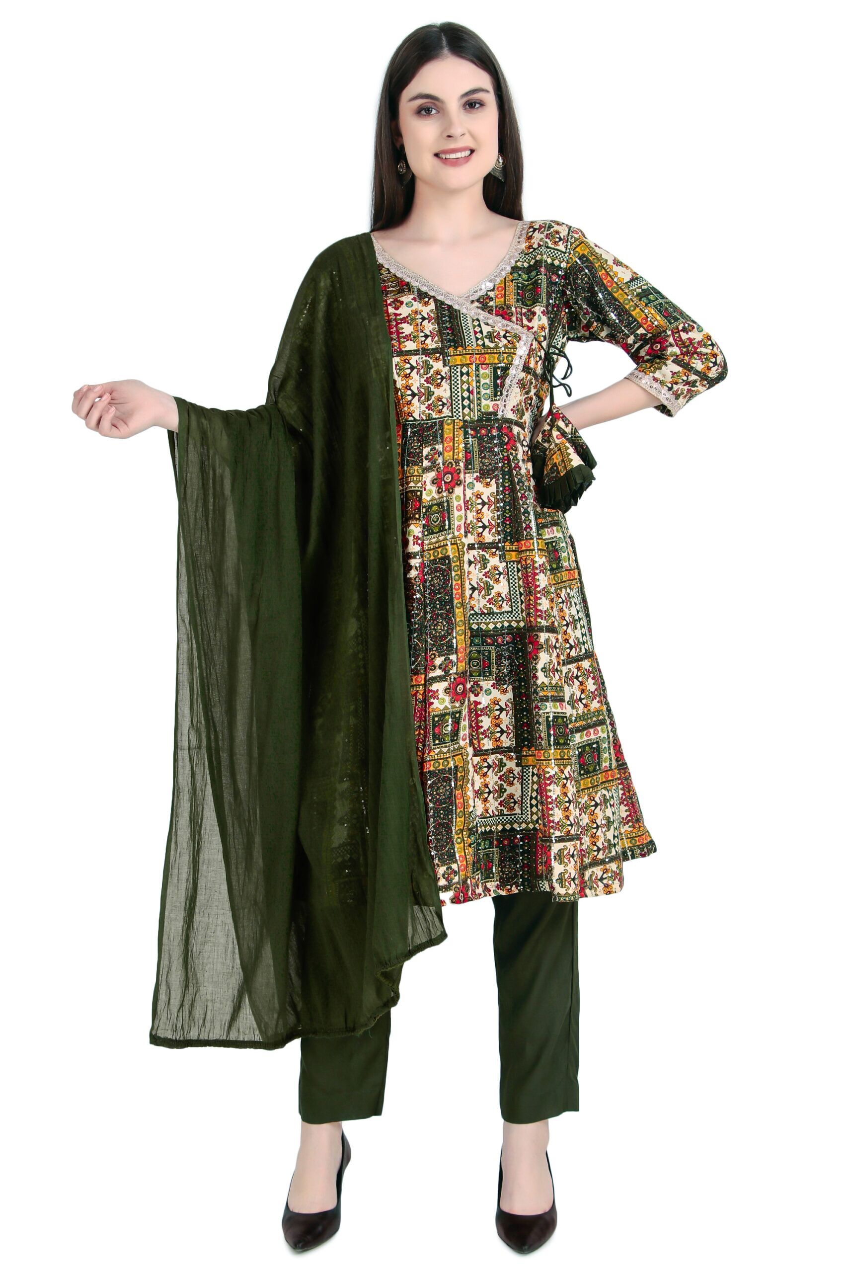 Women’s Printed Cotton Anarkali Kurti with Gota Lace Detailing – Multicolor | Jaipuri Print Kurti with Plain Pant and Dupatta Set
